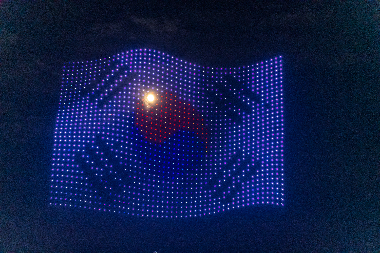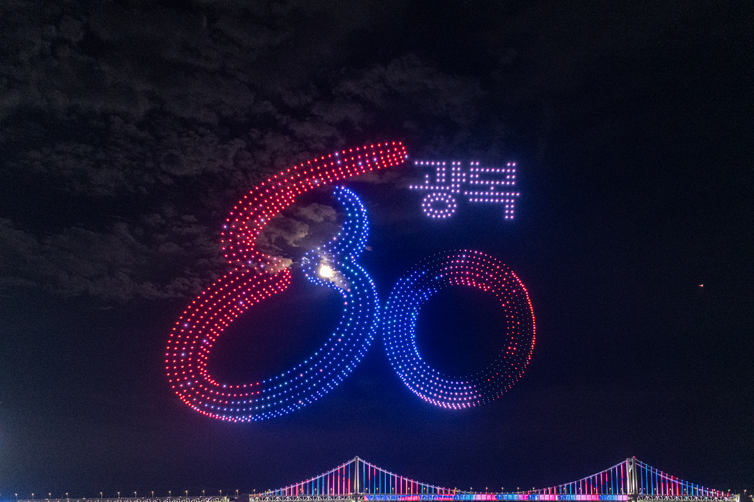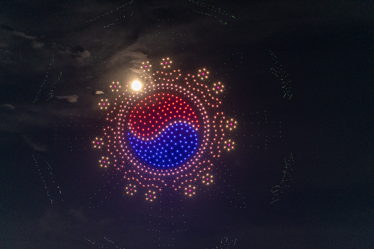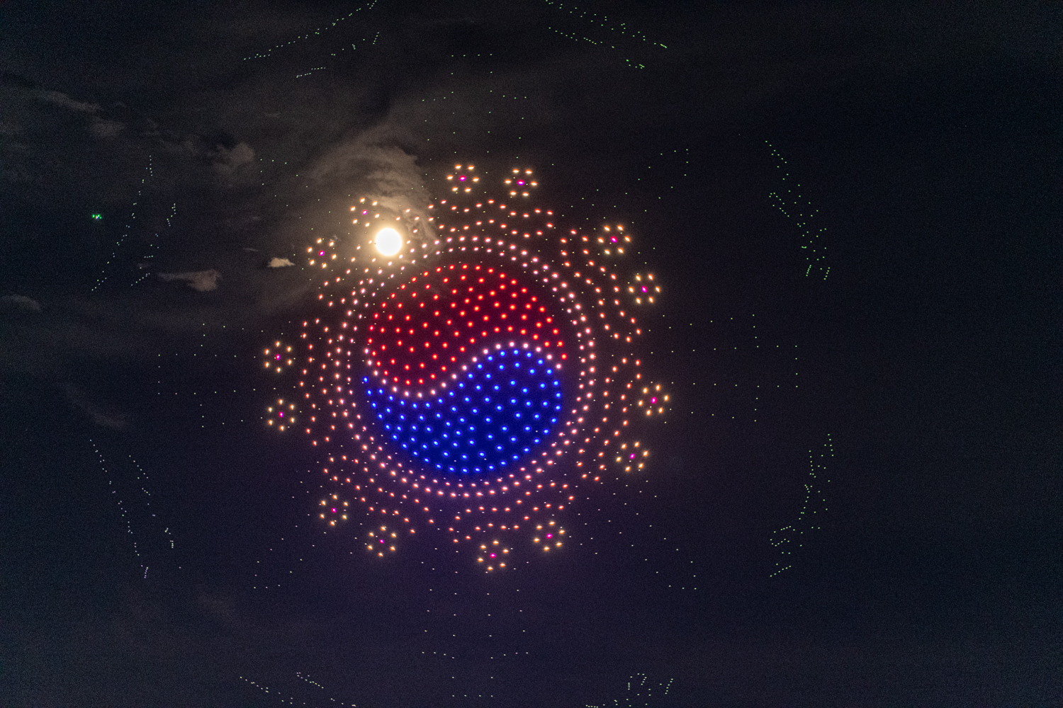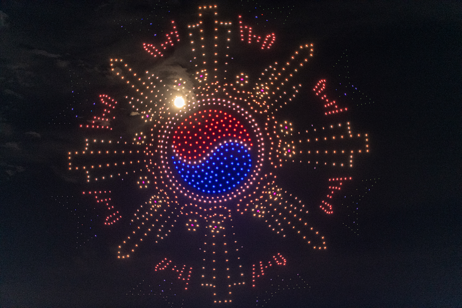 ▶드론 1500대를 이용 하였으며 광복80주년을 기념하여 80년의빛 미래를 밝히다 라는 주제로 시행 되었다.본래는 9일 토요일 20시와22시,2회에 걸쳐 시행 될 예정이었으나 9일 우천예보로 10일 일요일 동시간대에 시행된거다.달빛두 축하라두 해주는듯 온 달이다.
