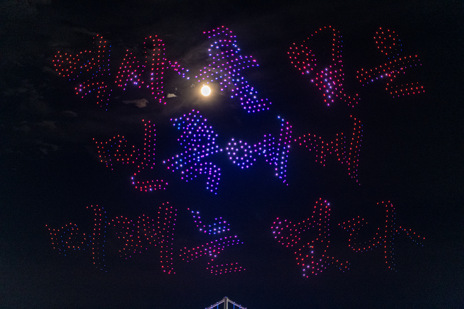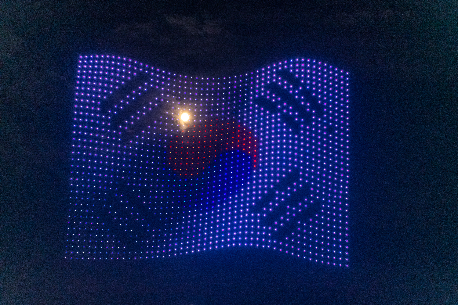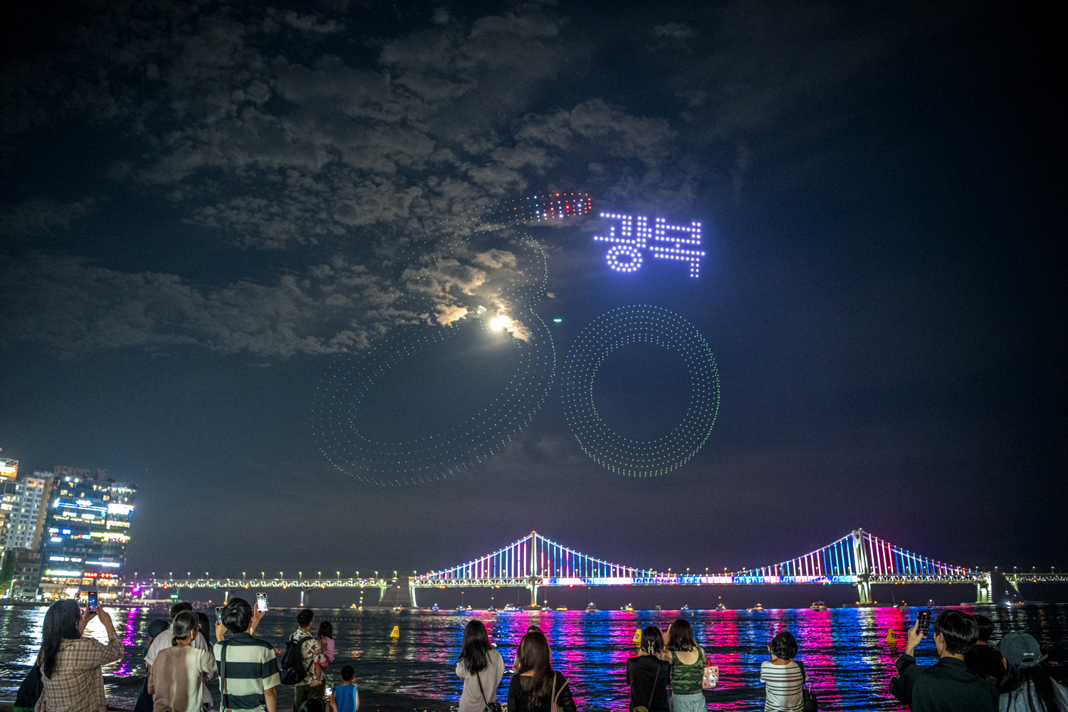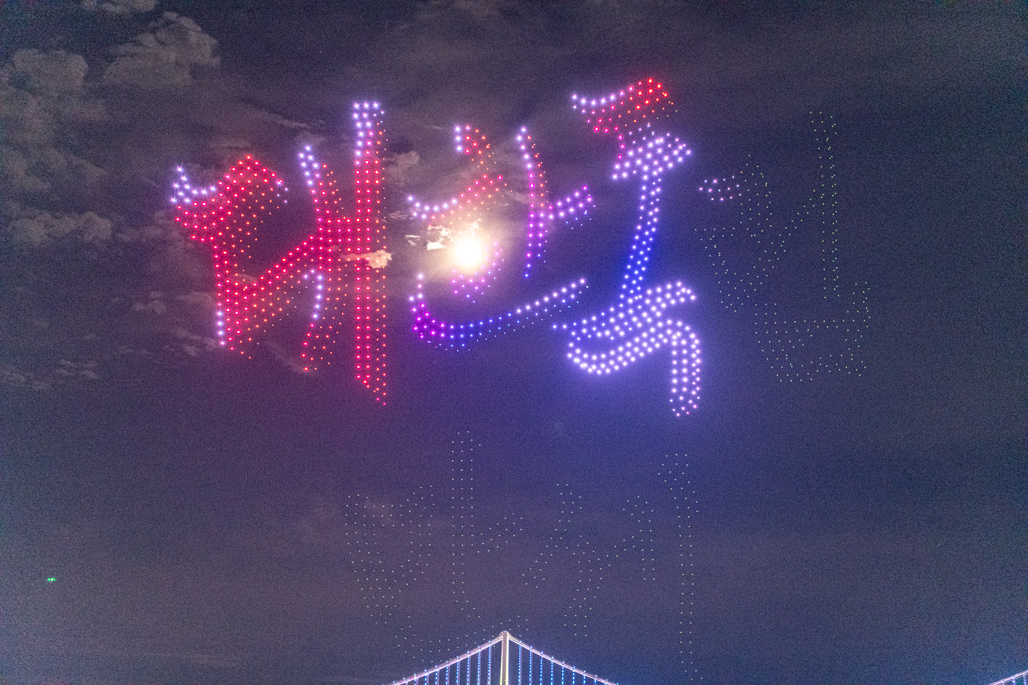 ▶드론 1500대를 이용 하였으며 광복80주년을 기념하여 80년의빛 미래를 밝히다 라는 주제로 시행 되었다.본래는 9일 토요일 20시와22시,2회에 걸쳐 시행 될 예정이었으나 9일 우천예보로 10일 일요일 동시간대에 시행된거다.달빛두 축하라두 해주는듯 온 달이다.