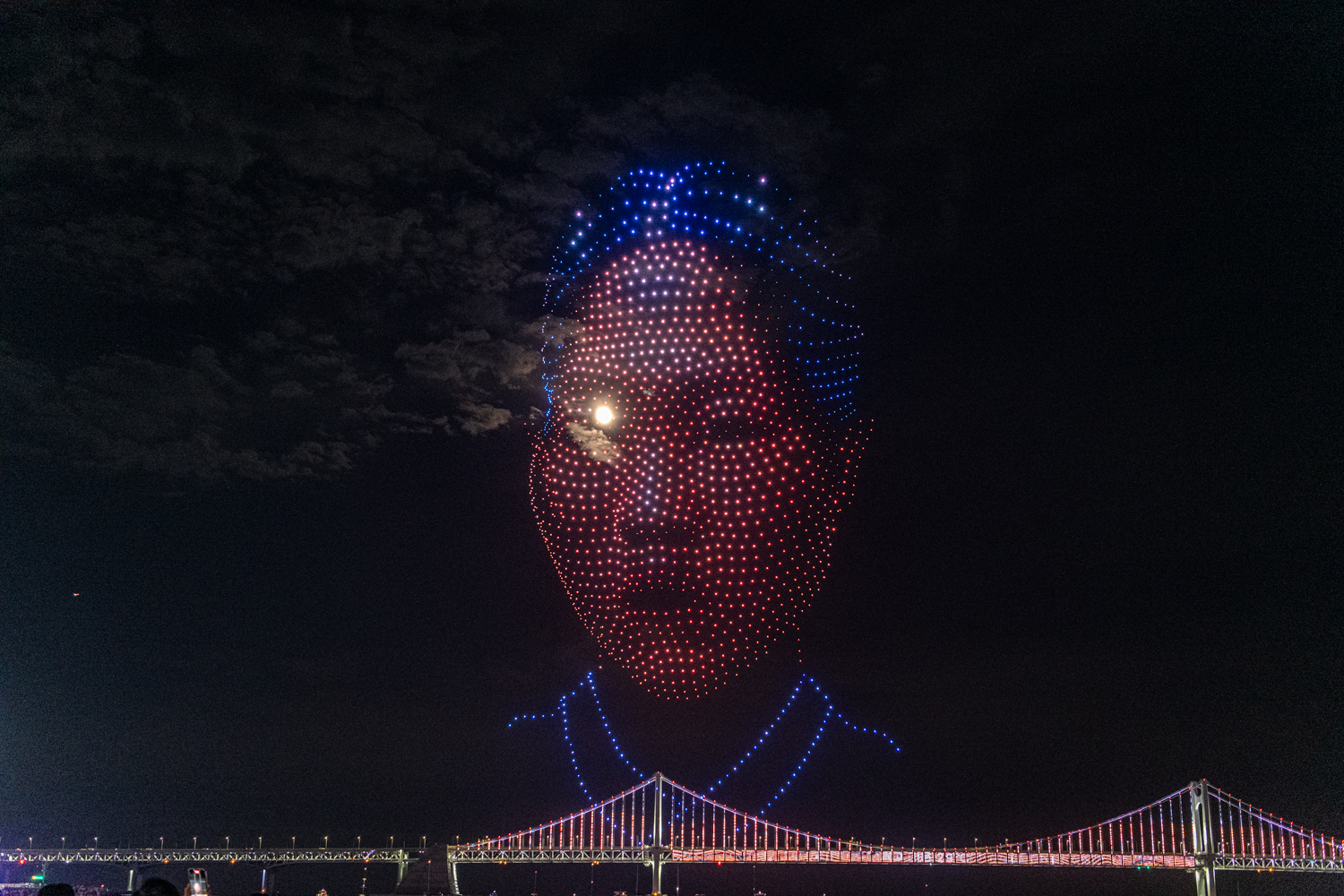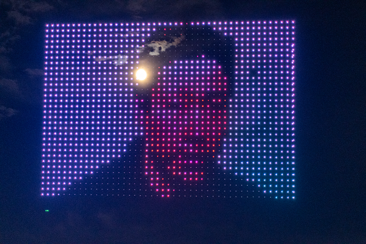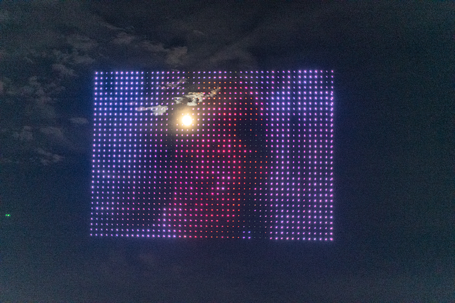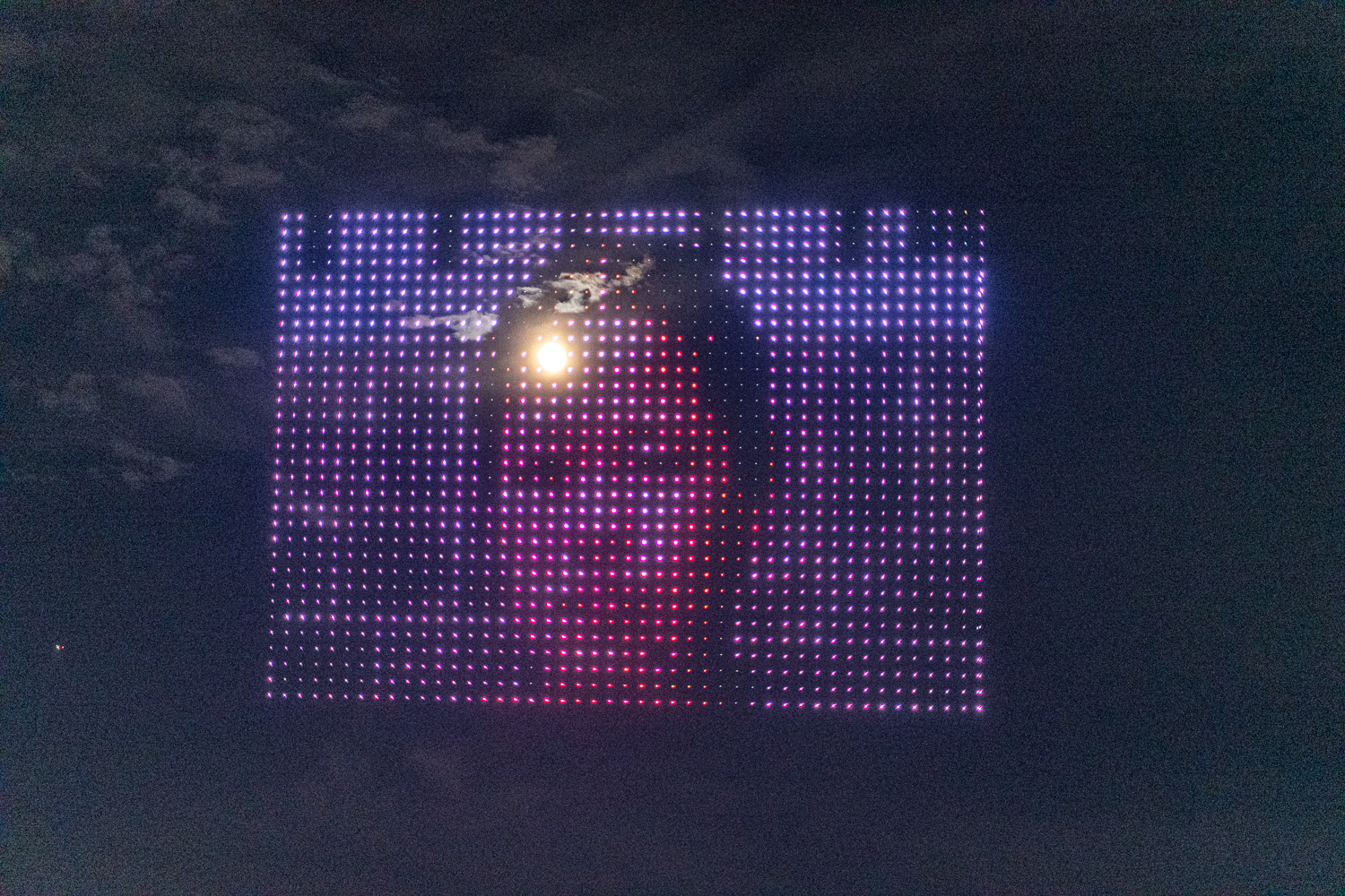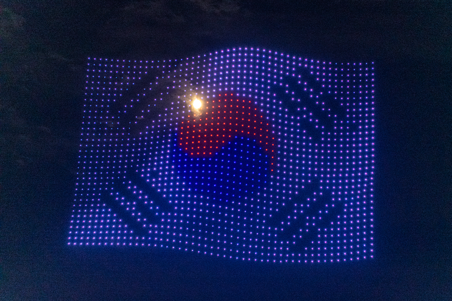 ▶드론 1500대를 이용 하였으며 광복80주년을 기념하여 80년의빛 미래를 밝히다 라는 주제로 시행 되었다.본래는 9일 토요일 20시와22시,2회에 걸쳐 시행 될 예정이었으나 9일 우천예보로 10일 일요일 동시간대에 시행된거다.달빛두 축하라두 해주는듯 온 달이다.