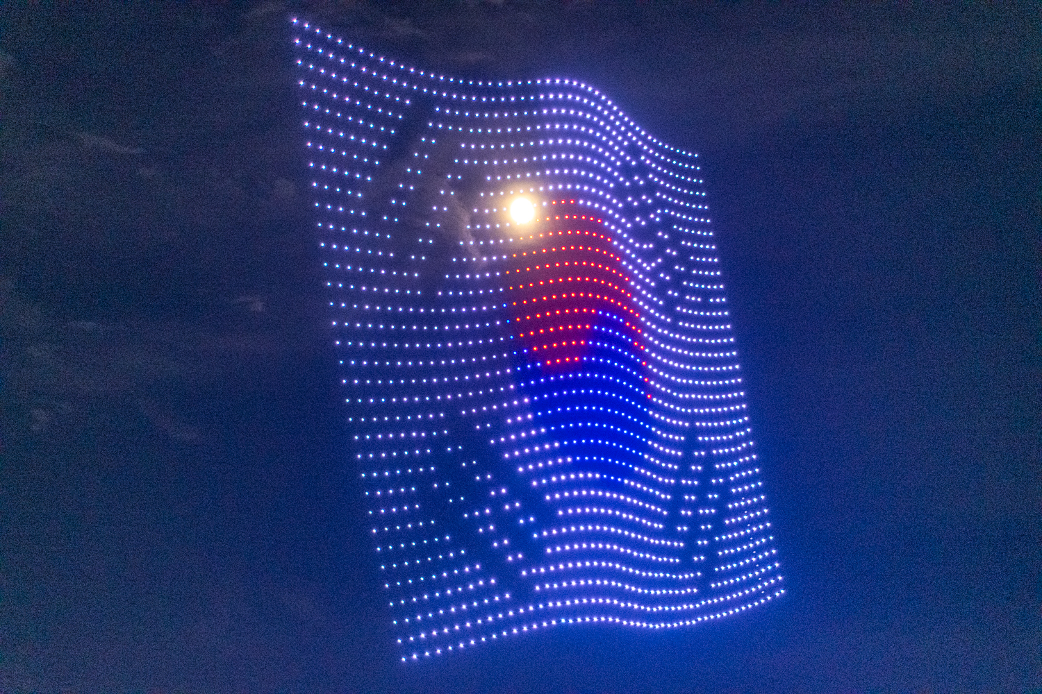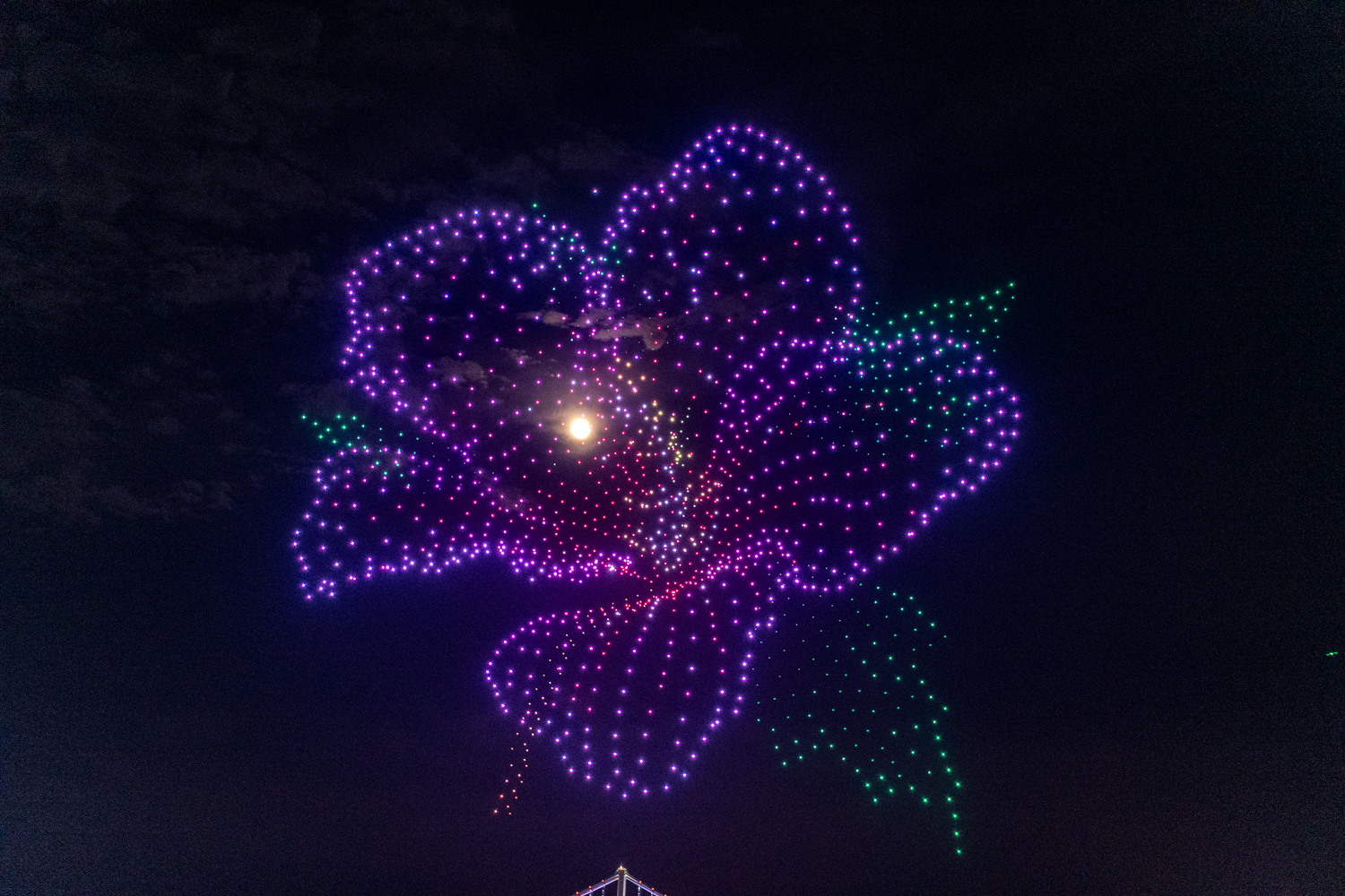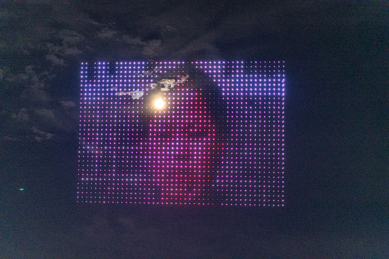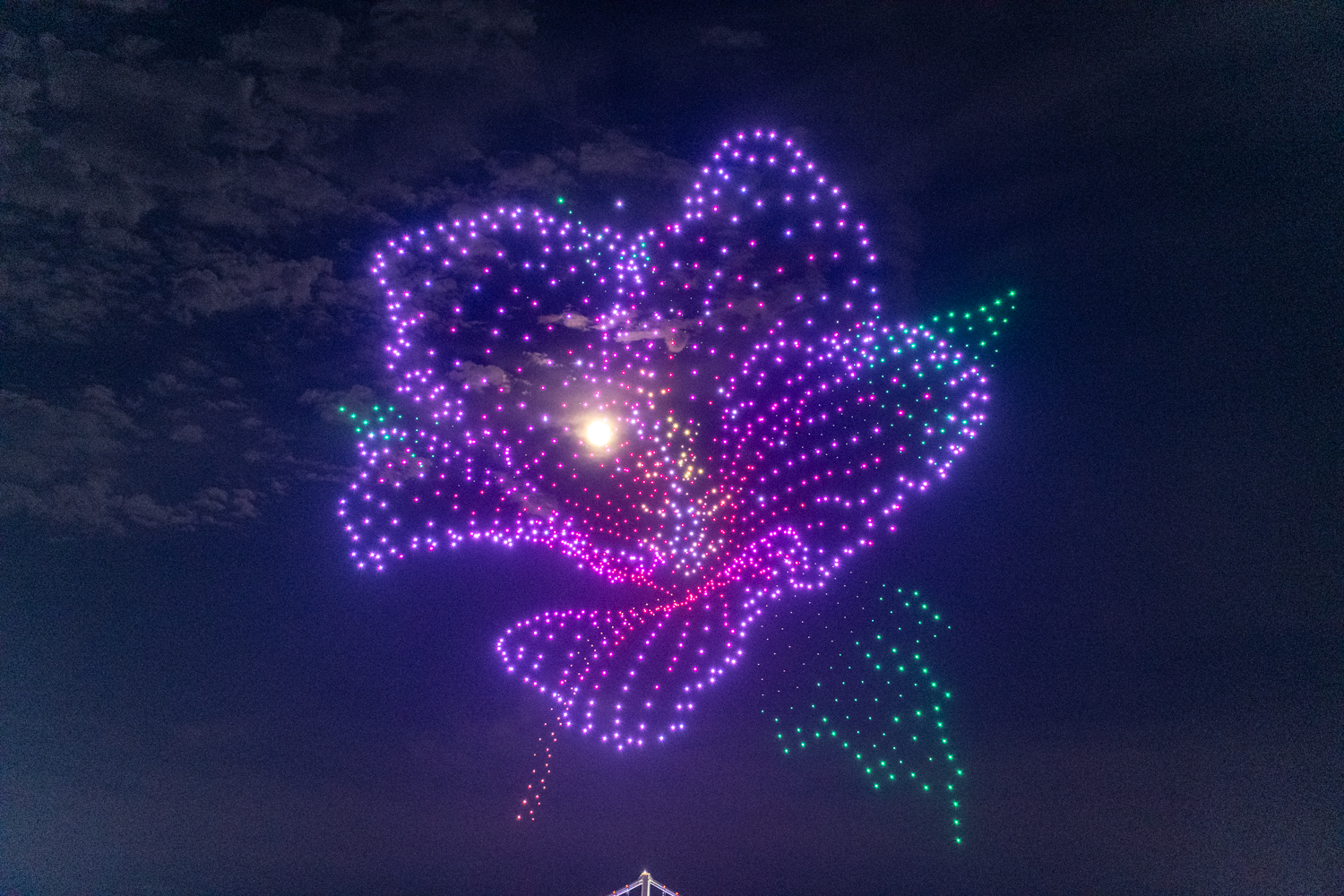 ▶드론 1500대를 이용 하였으며 광복80주년을 기념하여 80년의빛 미래를 밝히다 라는 주제로 시행 되었다.본래는 9일 토요일 20시와22시,2회에 걸쳐 시행 될 예정이었으나 9일 우천예보로 10일 일요일 동시간대에 시행된거다.달빛두 축하라두 해주는듯 온 달이다.
